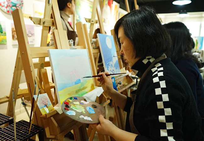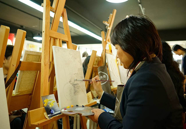 用圖畫裝飾生活,用畫筆記錄美好。盡管公司大部分女員工都并沒有太多的繪畫基礎,在作畫的過程中,許多人都碰上了困難,或者調不出理想的顏色,或者拿捏不準間架結構。但通過畫室老師的指導,以及同事之間的互相幫助,最終完成了一幅幅令人驚嘆的畫作。財務部周潔漪的星空圖奇幻燦爛、運營部徐苒子的櫻花樹夢幻美好、人力資源部總經理錢煒的向日葵生機勃勃,每一個人都在自己的筆下創造了美好與奇跡。