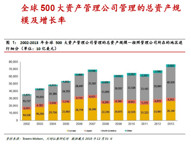1.關于全球500 大資產管理公司:1)截至2013 年年底,全球500 大產管理公司管理的總資產規模達到76.5萬億美元,同比增長12.0%,首超過危機之前的2007 年的水平;2)其中北美地區的資產管理公司的規模是42 萬億美元,同比增長17.0%;歐洲為26.3 萬億美元,同比長9.8;日本為4.6 萬億美元,同比減少5.5%;3)超過6 成的資產由全球前500大資產管理公司管理。
