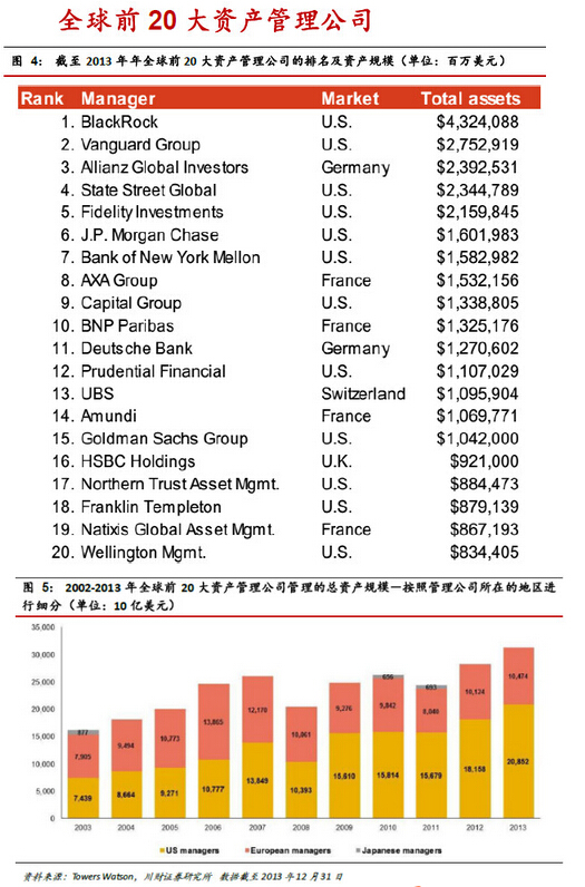 2013 年,全球前20大資產管理公司中有12家是美國公司,其余8家全是歐洲公司;