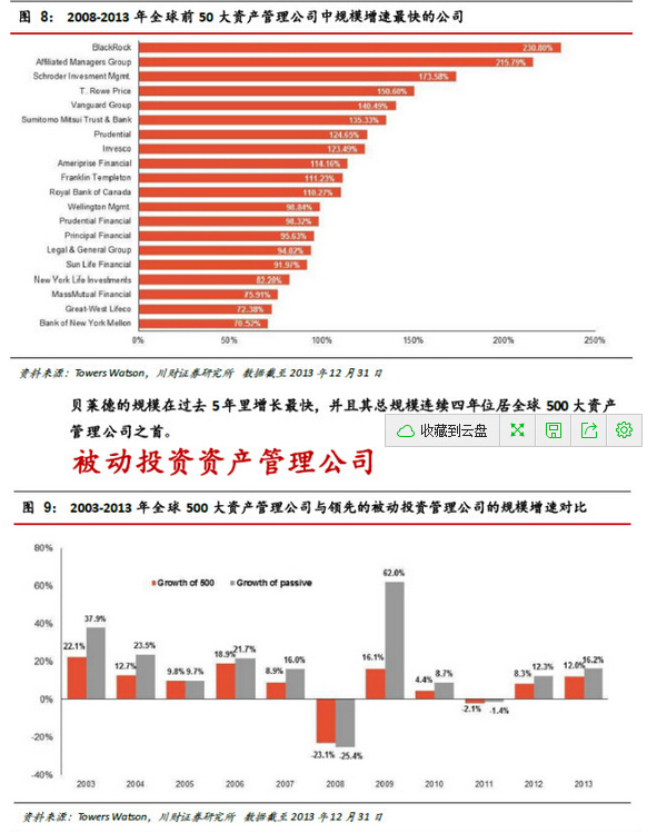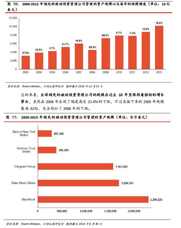 2.關于領先的被動投資資產管理公司:2003 年以來,領先的被動投資產產管理公司的規模增長迅速,年均復合增長率達到12.4%,而全球500大資產管理公司只有5.8%。