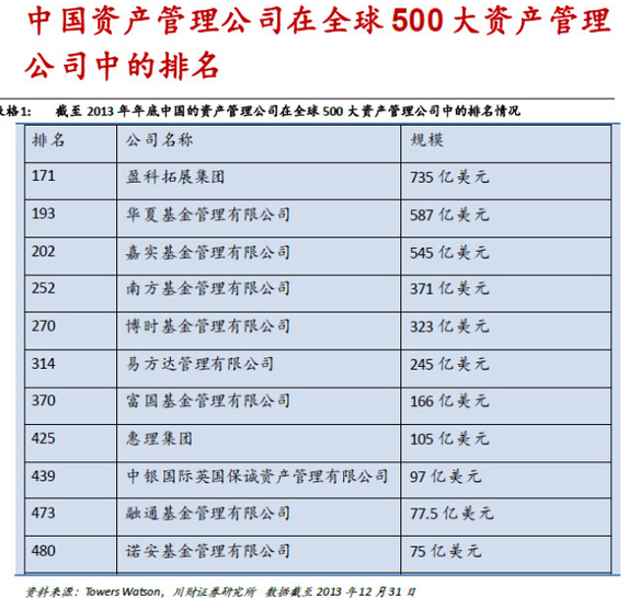 3.其它:1)截至2013 年年底,全球前20 大資產管理公司中有12 家自美國,8 家來自歐洲;絕大多數是銀行系和獨立資產管理公司,保險資產管理公司占少數;2)中國大陸的資產管理公司只有華夏基金管理有限公司一家勉強進入前200 名,而巴西卻有4 家資產管理公司排在前100名以內,中國的資產管理行業潛力巨大且任重道遠。
